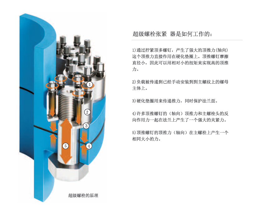 超級螺栓張緊器被設計來直接取代傳統(tǒng)的螺母和螺栓。這些裝置可以旋合于一個新的或者現(xiàn)有的螺栓,螺柱,螺桿或者軸上。主螺紋用于安置緊張器在螺栓或者螺柱上并靠在硬化墊圈及承載面上,一旦安置到位,螺栓或者螺柱的實際的張緊通過簡單的手動工具來擰緊環(huán)繞主螺紋一圈的頂推螺釘來實現(xiàn)。頂推螺釘均勻地傳遞預緊力到主螺紋上,從而,也傳遞到連接件上。主螺紋被純張力鎖緊。