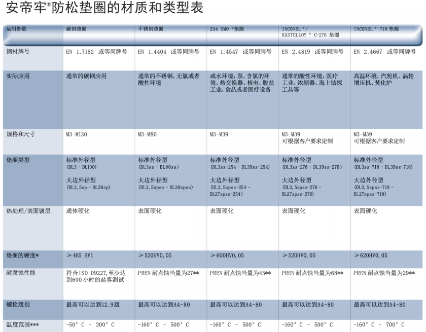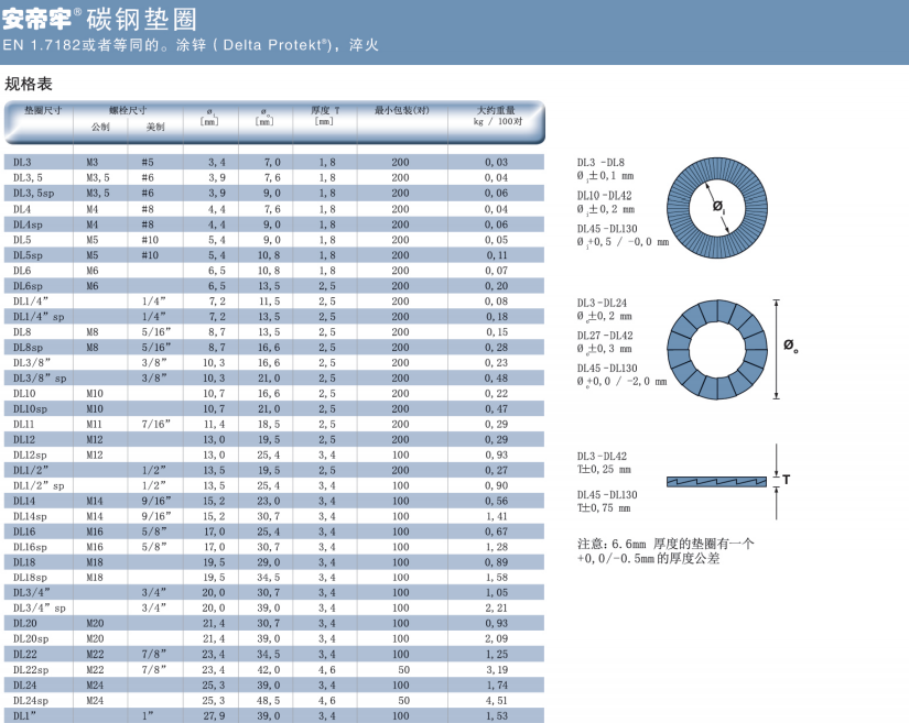 ANDI-LOCK防松墊圈提供以下材料和尺寸:碳鋼涂鋅墊圈 Delta Protekt(鋅薄片涂層 ),DL3-DL42(標準尺寸)和DL45-DL130(根據(jù)要求定制)。