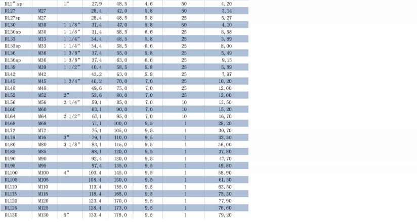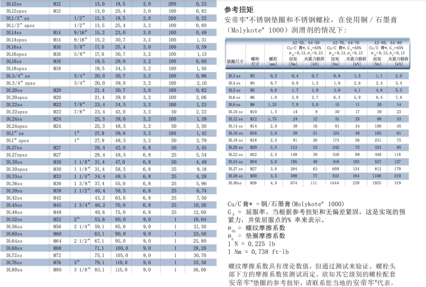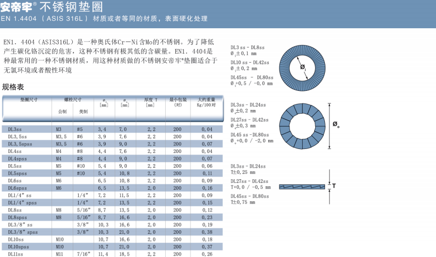 不銹鋼墊圈(EN 1.4404 / AISI 316L),DL3SS—DL42SS(標準尺寸)和DL45SS—DL80SS(根據(jù)要求定制)。